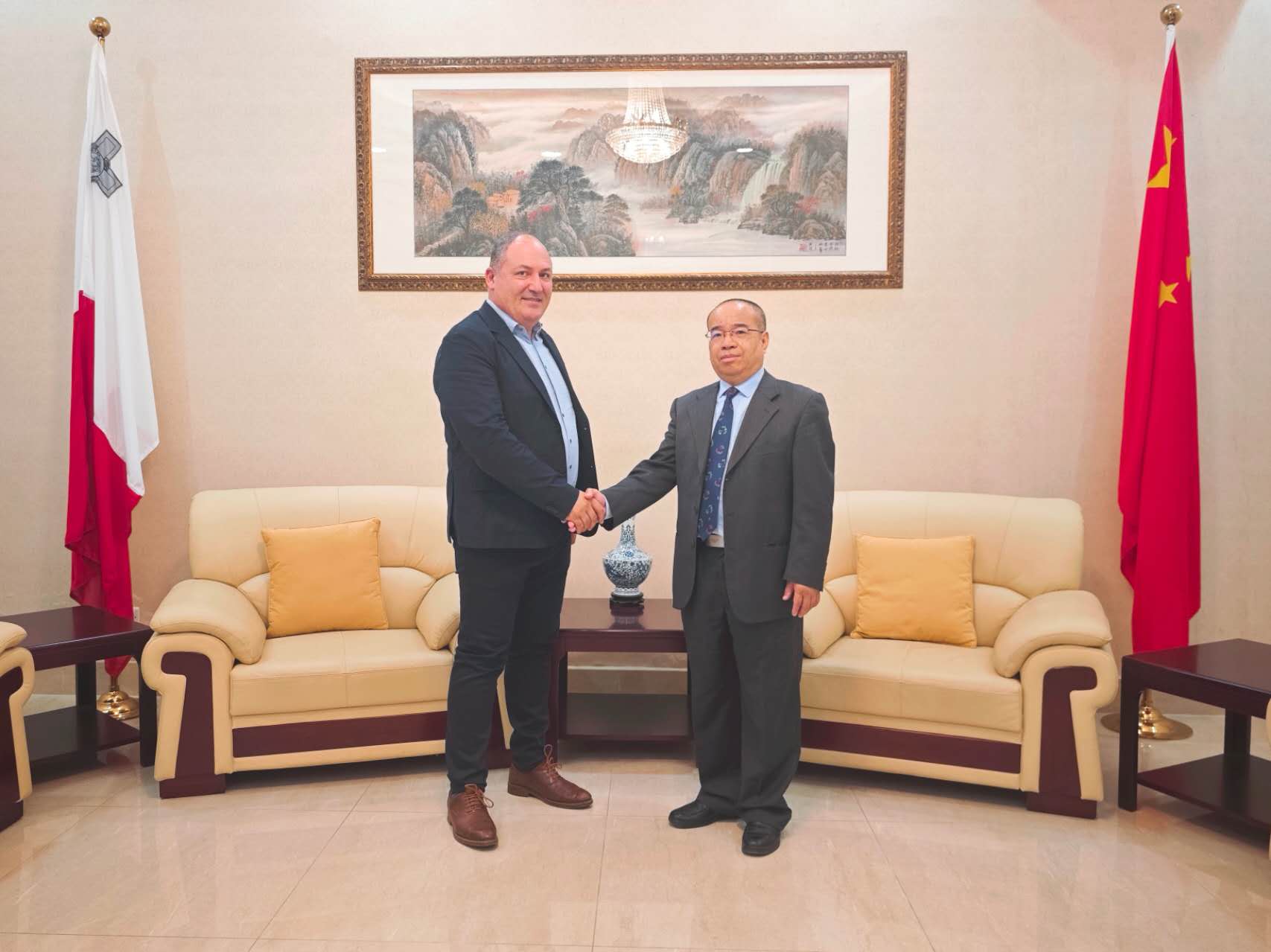 陈贵华参赞表示,中马两国建交以来,始终相互尊重、平等相待,在涉及彼此核心利益和重大关切问题上相互支持。陈参赞向其介绍了中国共产党二十届四中全会精神和“十五五”规划建议的主要内容,并强调,开放是中国式现代化的鲜明标识,中国共产党二十届四中全会为未来五年中国发展作了战略擘画,中国将坚定扩大高水平对外开放,高质量共建“一带一路”。中方的上述规划建议与马耳他“2050愿景”有诸多契合之处,中方愿在此基础上同马方深化在会展经济、文化旅游等领域的合作,努力推动双边经贸关系高质量发展。