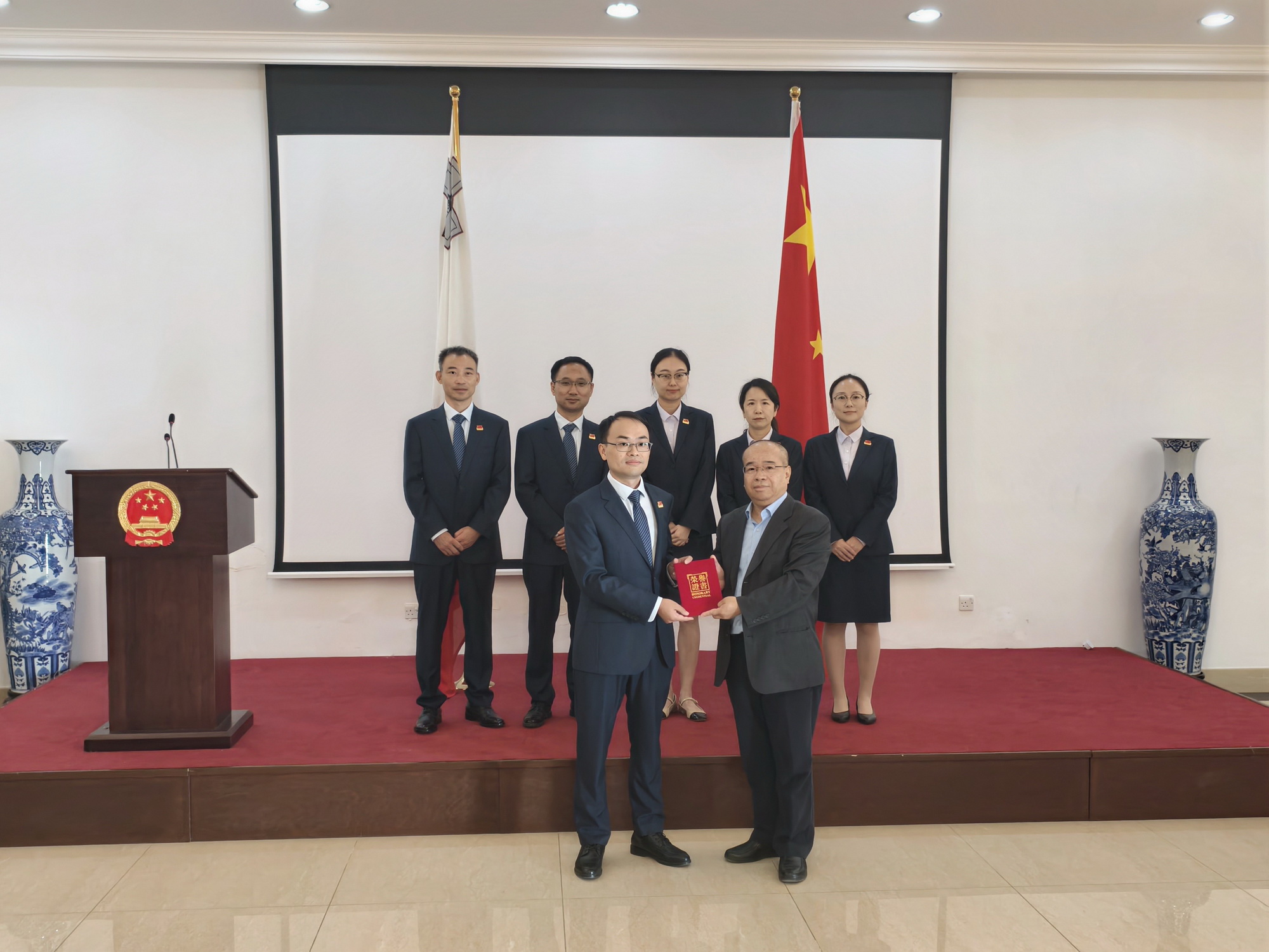 陈参赞代表使馆积极评价第20期援马医疗队一年来所取得的突出工作成绩,称赞他们以高超中医技术和优良医德为马耳他民众提供专业医疗服务,努力推进援马医疗各项工作,为加强中马医药卫生领域合作作出积极贡献,并向其颁发“岐黄使者杰出贡献医疗队”荣誉证书。